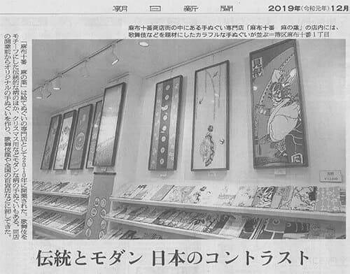 朝日新聞 12月20日掲載 2019.12.24 kanri01@artsou メディア掲載情報, 全て 本日12月20日発刊の朝日新聞のコラム「私の東京」で麻布十番 麻の葉が掲載されています。 ベネズエラ大使 が「おすすめのお店」として紹介してくださいました。手ぬぐい は外国の方への日本土産としても喜ばれます。ぜひ朝日新聞をチェックしてみてください。 つぶやき