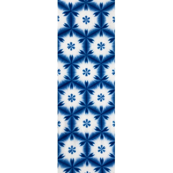 「雪花絞り」は三角形の2枚の板に晒し木綿をはさんで染料を付ける染色技法です。折る回数や染める回数により様々な絵柄が生まれ、 まるで雪の花が咲いたような美しい世界が広がっています。