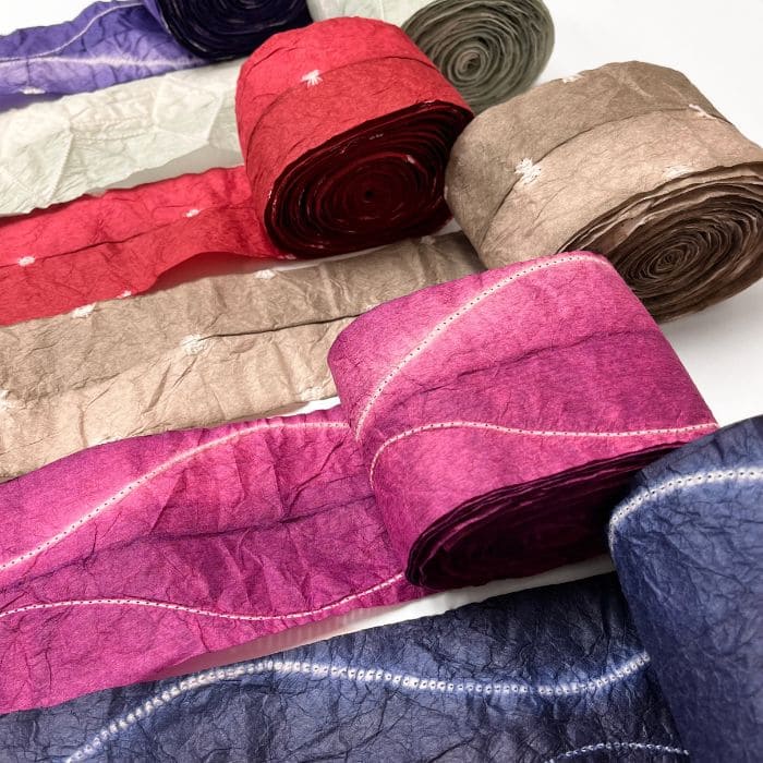 本来は完成品として表に出るものではなく、染めの工程を支える存在ですが、そこには美しい色や模様が残ります。染料のにじみや重なり、偶然に生まれた線や表情は、一つひとつ異なり、同じものはありません。