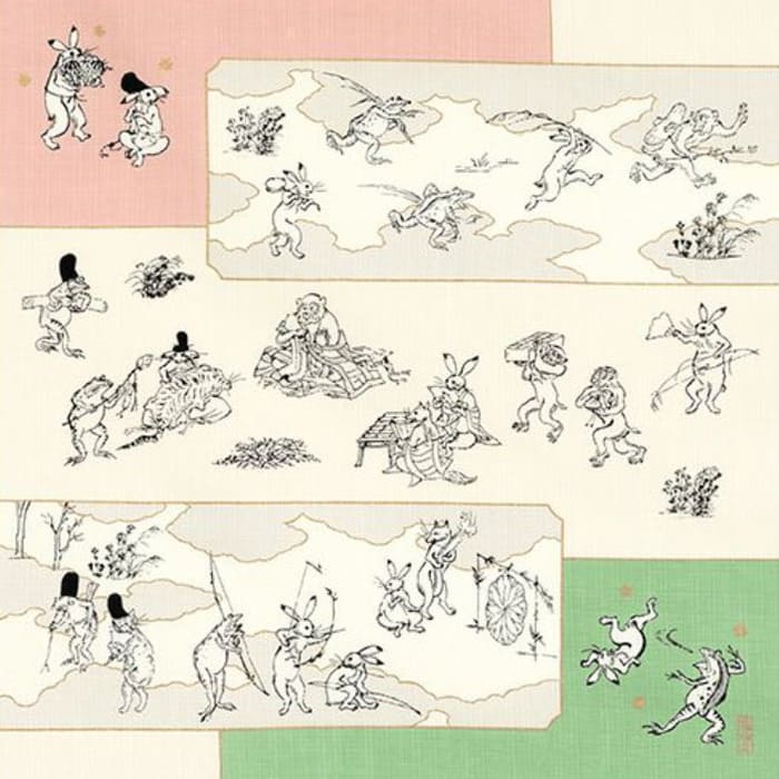 This small furoshiki translates the world of Chōjū-giga into a textile form.