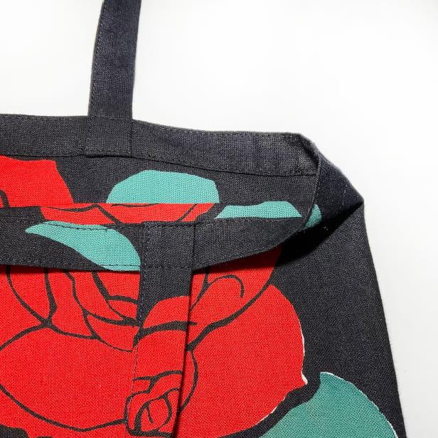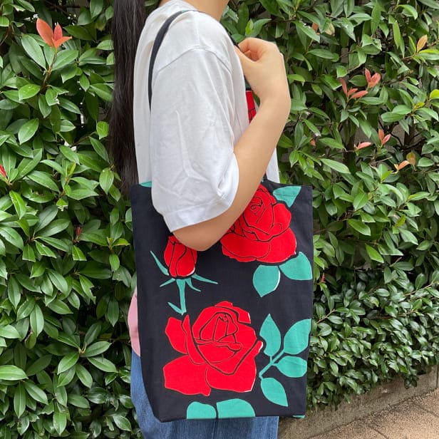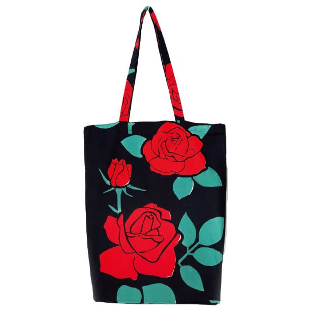 This tote bag is crafted from Asa no Ha’s original tenugui cloth featuring the playful “Roses” design.