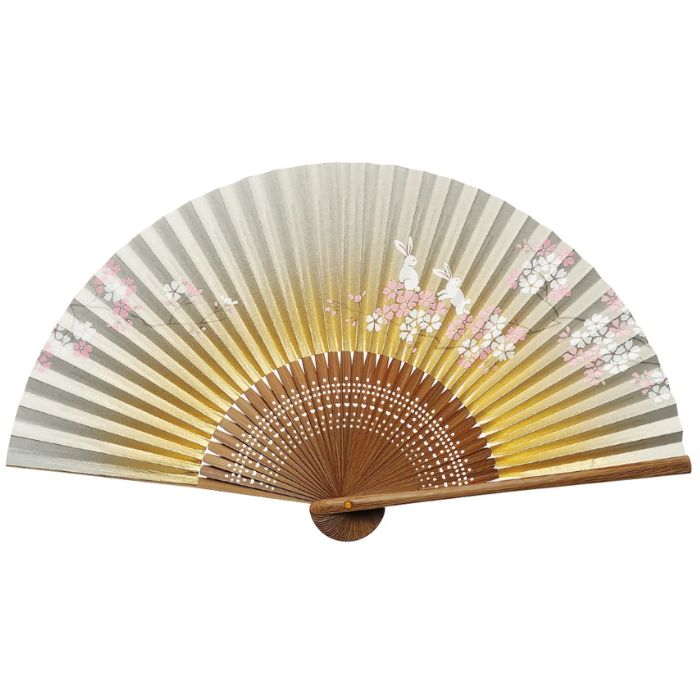 This elegant ladies’ paper fan features softly blooming cherry blossoms and rabbits on a pale pink fan surface. Delicate gold shading adds a refined touch of radiance, evoking the gentle beauty of spring.