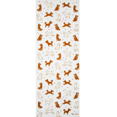 This tenugui depicts a Shiba Inu puppy playing with cherry blossom petals in the warm and peaceful spring weather. It captures the adorable gestures of a dog, running, sitting, and so on, and is a must-have for dog lovers.