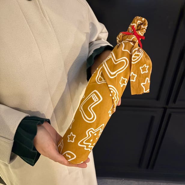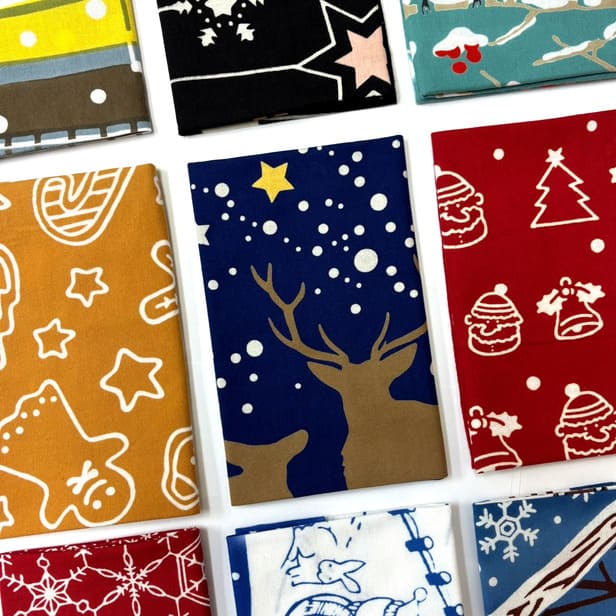 Drawing of lovely cookies in shapes of a gingerbread man, snowman, boots etc… Dyed with traditional Japanese colors “KITSUNEIRO”. Great as a Christmas present, it can also be used for wrapping candies or a bottle.