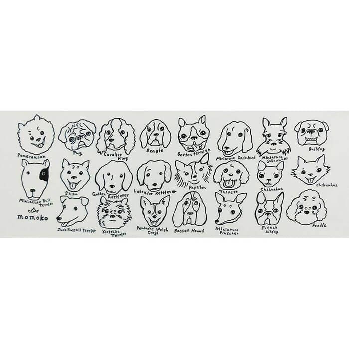 Pomeranians, Maltese, Pugs, Beagles, Boston Terriers, Chihuahuas… 23 dog breeds in all are depicted on this tenugui. The expressions and atmosphere of the dogs are so realistic that dog owners and dog lovers will love the design. It is dyed based on an original drawing by picture book artist Momoko Yamanaka.