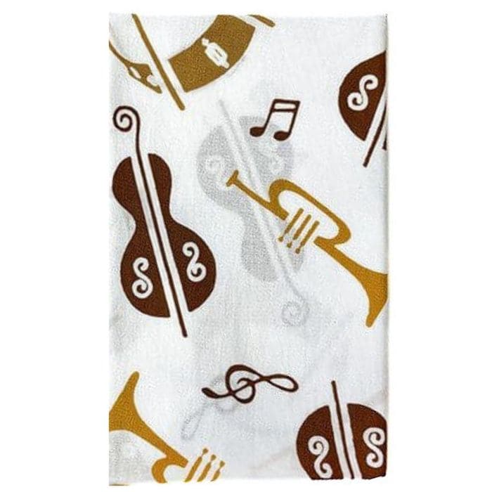 Is the music you hear classical? Or is it jazz?This hand towel features orchestral instruments such as cellos, trumpets, saxophones, pianos, harps, drums, etc., with musical note patterns.It is recommended for cleaning instruments and keeping dust away.