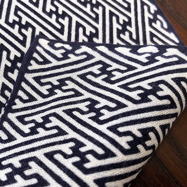 卍をつないで菱型に変形させた崩し文様で、卍は無限、力、幸福などを表すことから、卍が連なったさや型は不断長久や長寿の願いが込められています。紺色は「褐色(かちいろ)=勝色」と呼ばれ武士から好まれていた伝統色です。風水では紺は集中力を高め学業やビジネスの成長運・勝負運を上げる色とされています。生成りの地色に紺色で染め上げられたさや型文様の手ぬぐいは、粋でかっこよく洗練された日本文化の美しさを表しているようです。